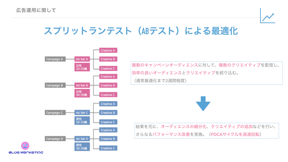 大凡3ヶ月で「どのキーワードがとれるのか?」「取れるバナークリエイティブの傾向」といった目安がわかるため運用最適化が完了します。