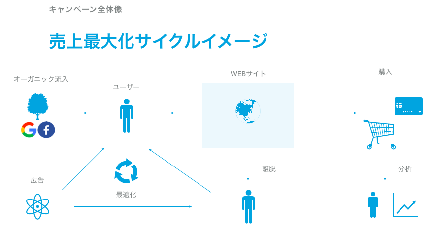 その上でGoogleやFacebook、Instagram、そしてインフルエンサーといった広告手法を増やし、購入見込みの高いユーザーをWEBサイトに誘導していきます。