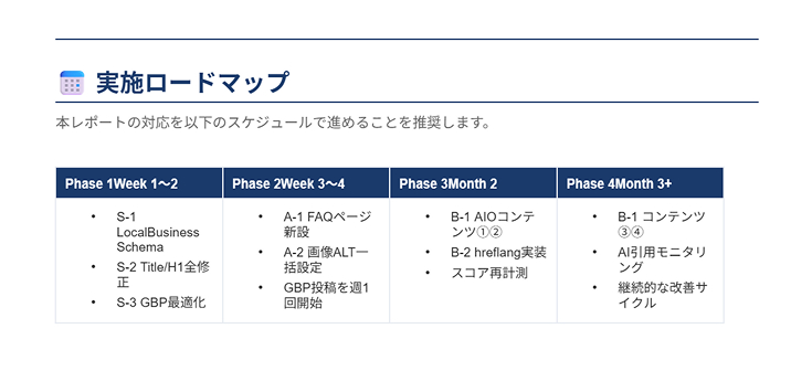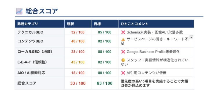 URLをお知らせいただくだけで、現状のスコア・優先度別の改善項目・実装すべきコードまでをまとめた診断レポートを、48時間以内に無料でお送りします。